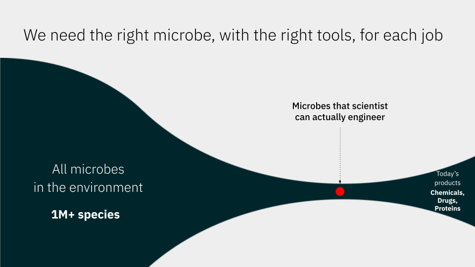 Right now, most R&D in labs and in industry is done only in a handful of organisms rather than working with what is available in the wild, purely because it’s really hard. It took our founders - they worked with one novel organism - it took them their entire postdoc to be able to grow it at all, which means it is inaccessible for people in academic labs or people in industry to make that investment, all to barely be able to get to do the science.