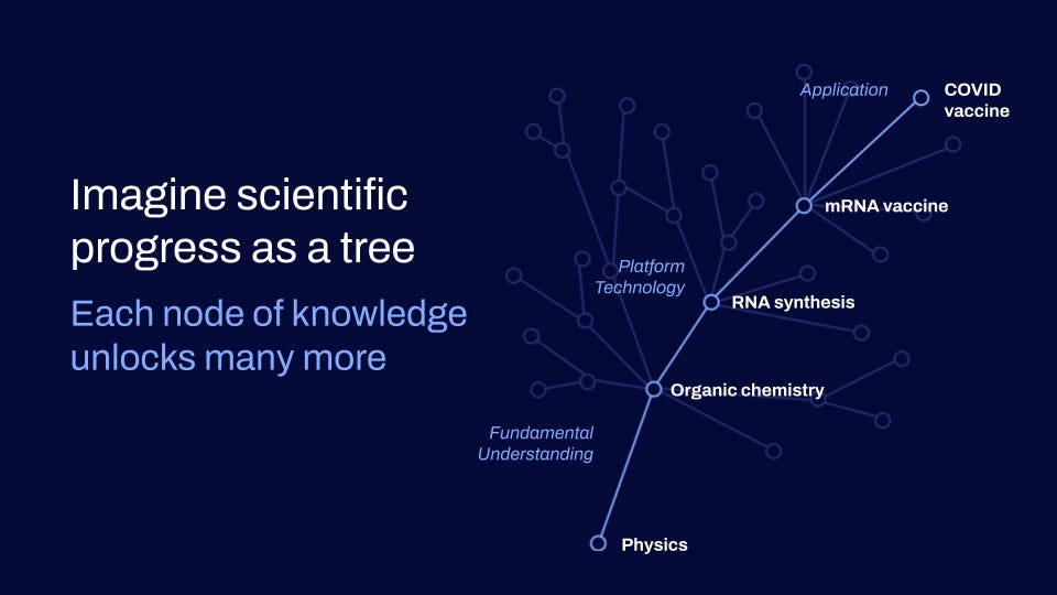 Imagine that science is a tree. And that progress goes from the core of that tree, where it’s a very core understanding - something like math or physics - out to the branches, where the fruit are the things that we use in our everyday lives. Let’s say that you want the fruit of that tree, something looks like curing psychiatric disease and neurodegenerative illness, training better and more aligned neural nets, answering deep questions about consciousness.