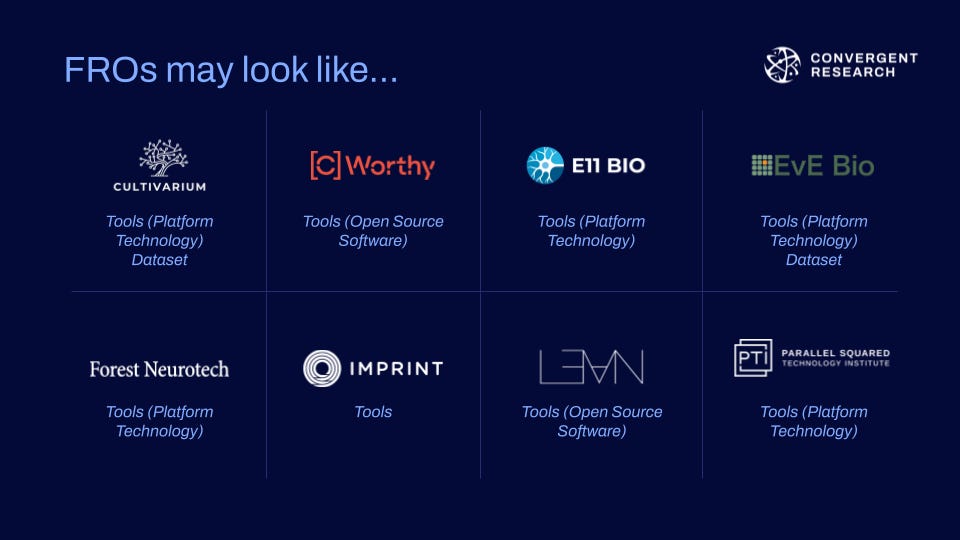 They are one new type of organizational form for producing scientific public goods. But we are not the only organization building FROs anymore - there’s a new one in the UK called BIND that just launched with Research Ventures Catalyst. We are working with ARIA now to launch one in the UK.