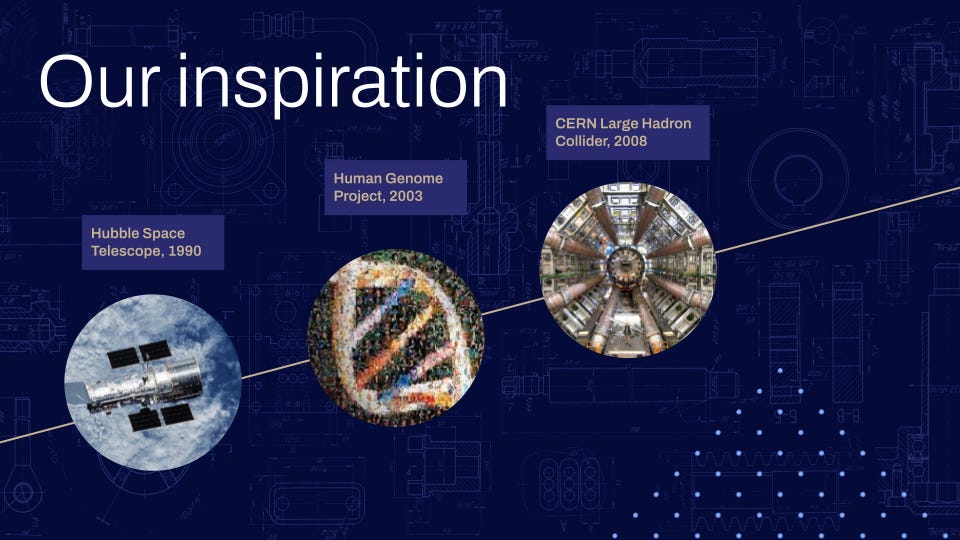 We’re inspired by the large-scale science projects that created the fundamental capabilities needed to change fields, like the Human Genome Project, the Large Hadron Collider at CERN and the Hubble Space Telescope. These are examples of grand projects that were pivotal in accelerating their fields and that produced critical research resources. They were platforms that teams of biologists, astronomers, and physicists built on for decades after they were completed.